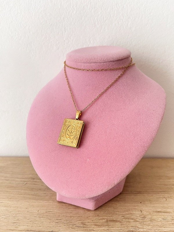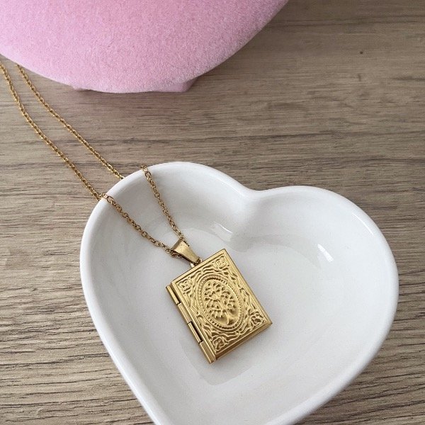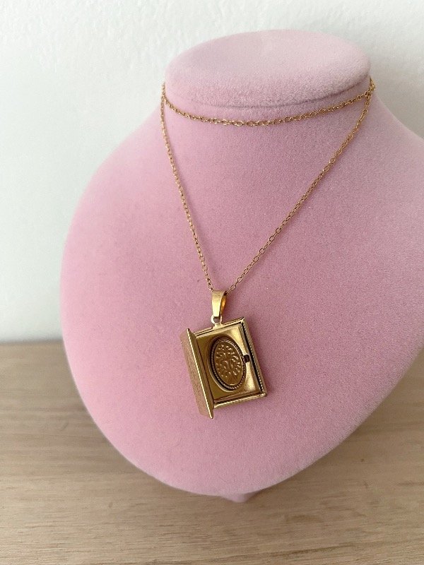 Relicario con espacio para dos fotos de acero dorado, no se destiñe ni decolora incluye 2 fotos a elección tener en cuenta si es para regalo, enviar las fotos a tiempo.