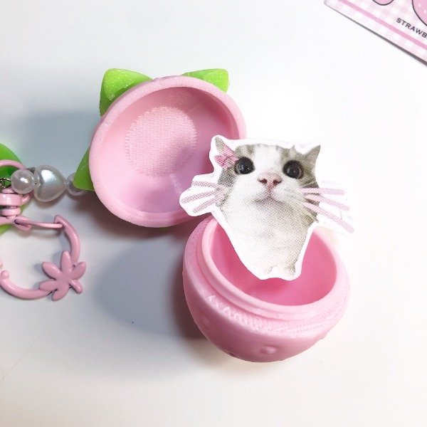 diseño exlusivo solo 4 disponibles. se pueden guardar cositas chicas como pastillas o anillos, es a rosca ideal para llevar en la mochila o bolso. el mosqueton (gancho) puede variar entre frutilla o moño rosa sin elección
